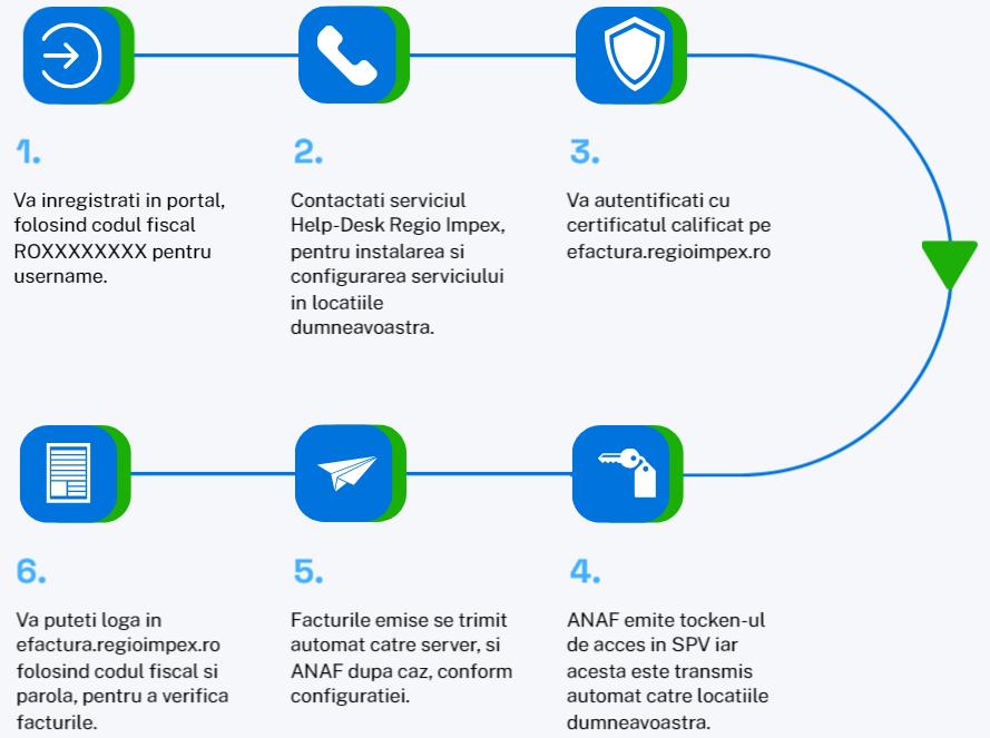 Serviciul efactura.regioimpex.ro pune la dispozitie un canal securizat pentru gestionarea autentificarii in SPV. Persoana cu drept in SPV, se autentifica pe efactura.regioimpex.ro cu certificatul digital calificat. Se obtine un token de acces valabil 90 de zile, in baza caruia facturile se trimit automat in SPV din fiecare locatie. Tocken-ul se reinnoieste automat in cazul in care expira, sau manual in cazul in care este revocat de ANAF. Pe efactura.regioimpex.ro se poate verifica statusul token-ului, si al trimiterii facturilor catre ANAF.